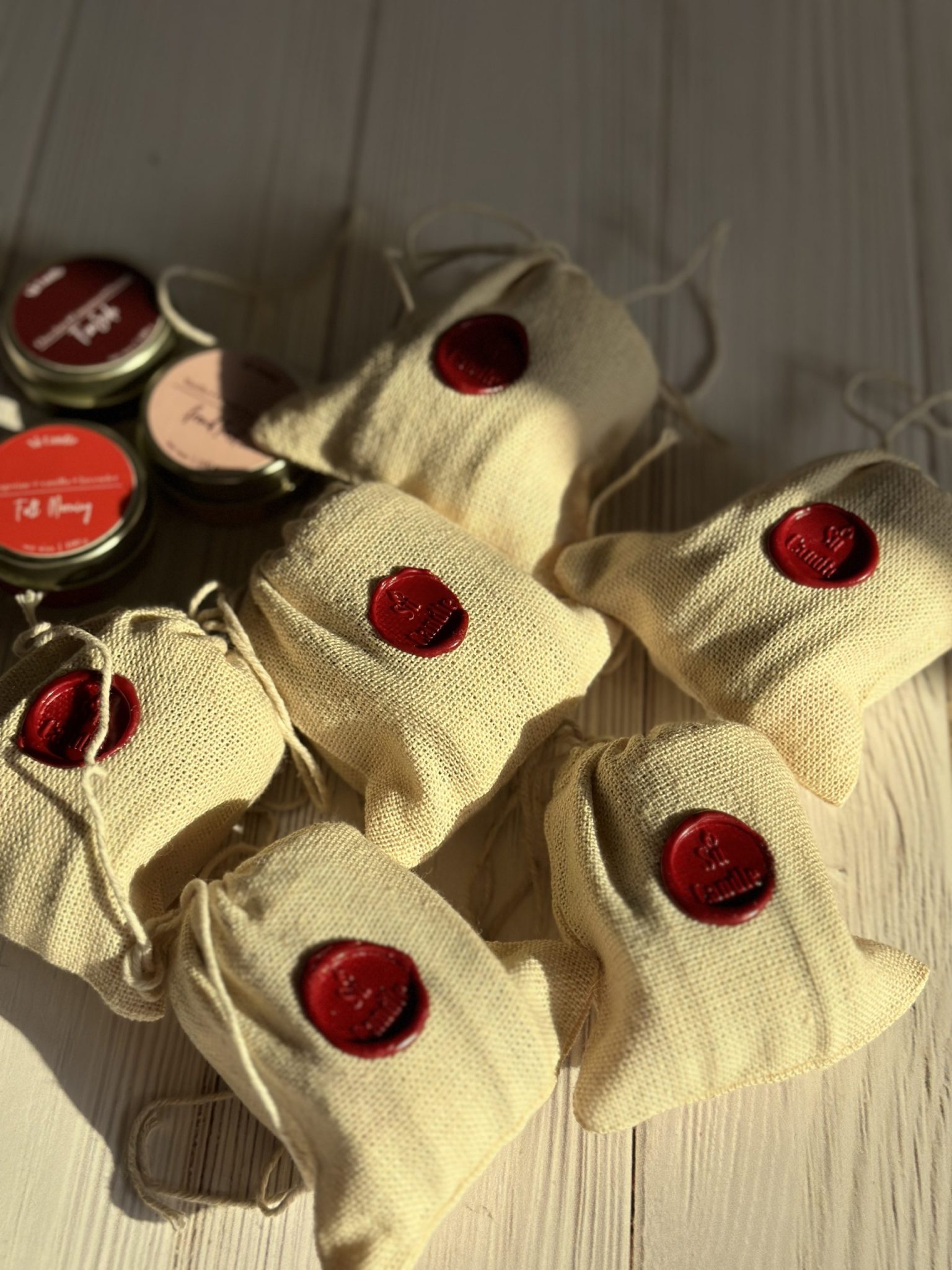شمعهای قوطی فلزی سایز کوچک با قطر ۴٫۵ سانتی متری همگی در یک کیسه پارچه ای مهروموم شده قرار دارند.